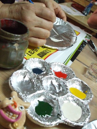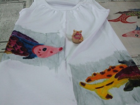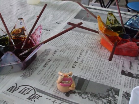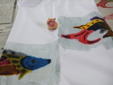 まだお子ちゃまの塗り絵のようですが、これから2・3日乾かせて、その後ぬるま湯につけて糊をキレイに取ります。さていったいどんなのになるか乞うご期待!!