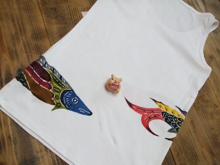 うしろもgood!前は女の子のグル子ちゃん、うしろは男の子のクン男君でございます。二人合わせてグルクンだ~ き~みとボクとでグルクンだ~♪と、ヤン坊&マー坊ばりの仲良し二人組です。そのうち1号が、このグルクンタンプトップを着てそこらへんを徘徊していることでしょう。グフフ☆