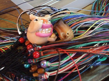 これが1号の選んだひもとビーズ。2個のストラップを作成します。ついこの間自分の分のストラップを作った1号、作り方をとっくに忘れています☆