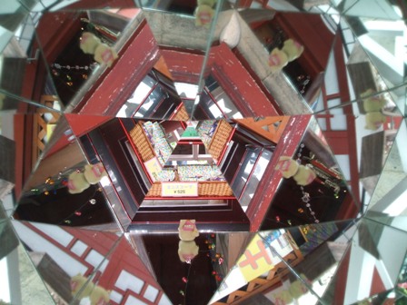 おぉぉぉぉ!!万華鏡がいっぱいあるぞー!すると金ちゃんを「これ・・・ブタ?」と言いやがった変なクロちゃんが「金ちゃん、おもてにある大きい万華鏡に入ってみたら?」とアドバイス。どれどれ・・・