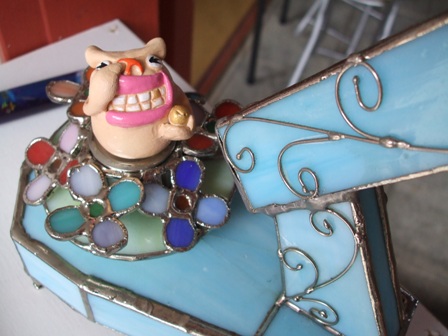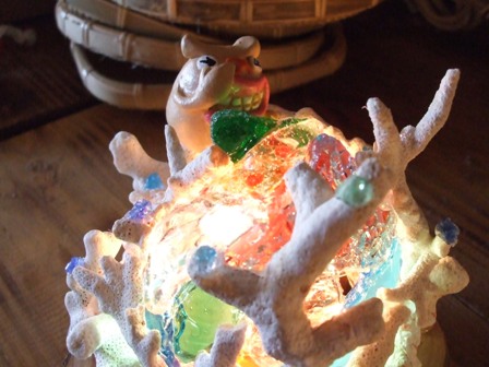 顔がものすご~~~~~~っく濃い『グラスアート 彩工房』の佐久間さんから譲ってもらった琉球ガラスを使って海のランプを作っているんじゃないかぁ!!すんげ~キレイ!ベリービューティフルやなぁ☆