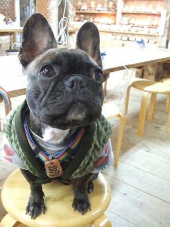 トレーナーにジーンズのオーバーオールにちゃんちゃんこ。