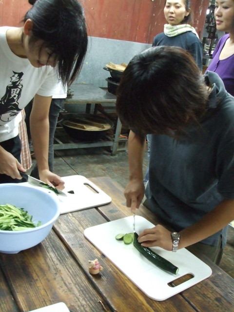 きゅうりを切る2号&5号・・・不器用です。でもみんなが見守る中、頑張っております。