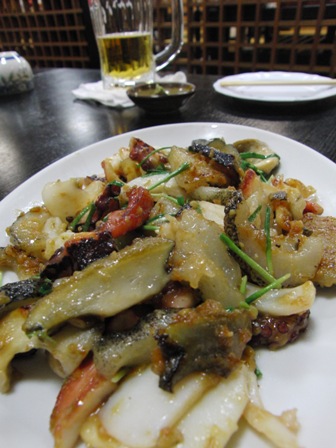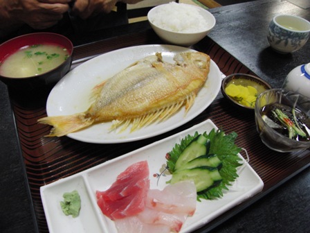 島定食は、魚のバター焼き・刺身・もずくがのっていて、