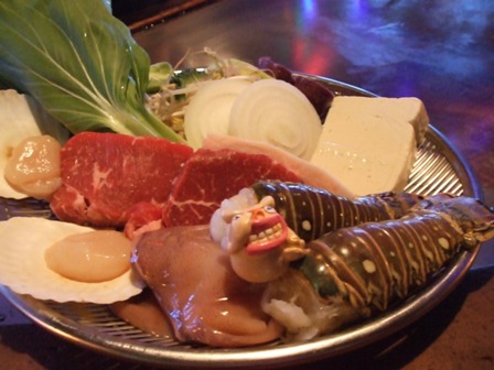 やって来たステーキ屋さんは恩名村にある『ステーキハウス ジャム』さん。初めてのところなのでドッキドキ☆目の前で焼いてくれるそうで、鉄板の前に三人でならびます。いちょびった我々は、ステーキ&海鮮&ロブスターコースを頼んでみちゃいました!なになに、『コースには、スープ・サラダ・パン・焼ヤサイ・ごはん又はメン・シャーベット・フルーツ・ティーがついています』だとぉぉぉぉ!!で~じ上等じゃないか!!かかって来い!!