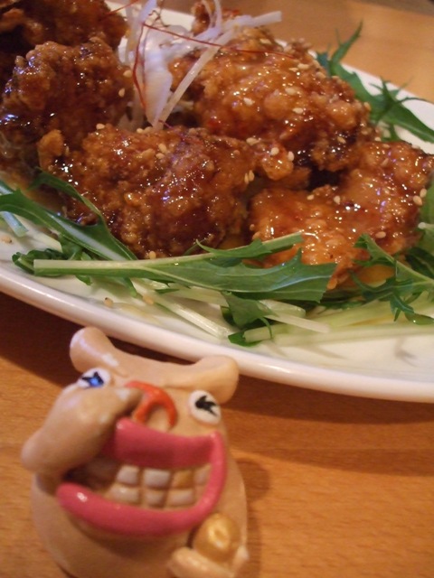 レインボーの人気おつまみメニュー。カラッと揚がったお肉をチリスイートとマヨネーズのソースで絡めた絶品料理!