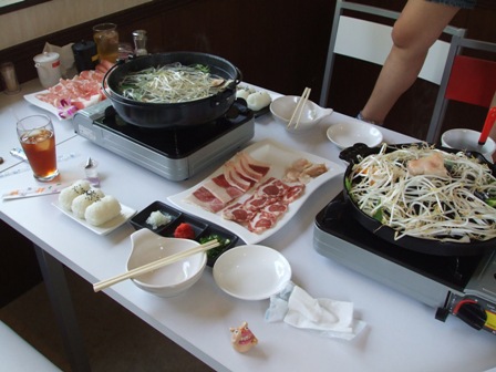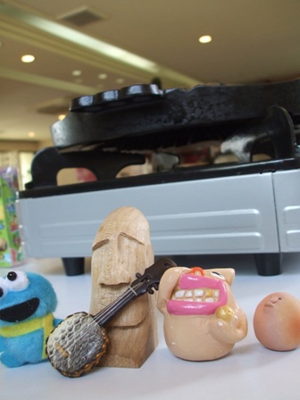 さて何にしよ~かな?我々はジ・ジ・ジンギスカ~ン チャ~チャラ チャ~チャラ チャラララ~ン♪としゃぶしゃぶをチョイス!待ってる間に金ちゃんとコンコンベがAきよのお供、モアイやん&ロンたんとなぜかコンロの前で記念撮影。金ちゃんモアイやんに三線を教えてあげます。そうこうしているうちに・・・