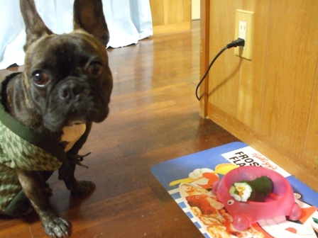 コンビニ恵方巻きを食べるちびクロ1号。